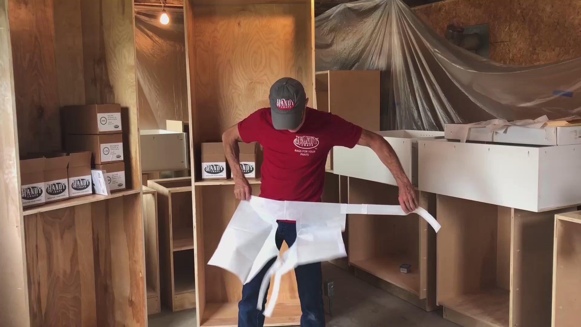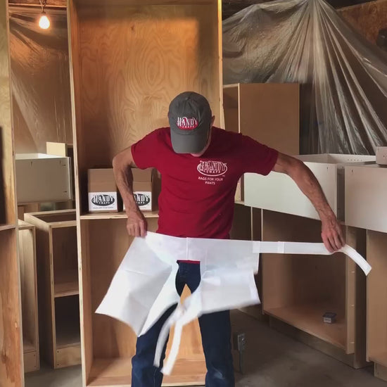 The Original Handy Chaps. Disposable clothing protection product ideal for painters, drywallers, DIY’ers, mechanics, gardeners or anyone else who wants to protect their pants.